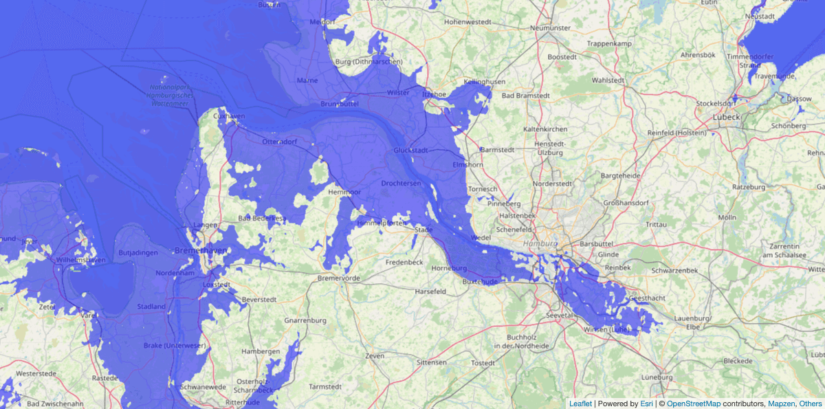 A flood map from floodmap.net. The image shows an area of Germany with different areas colored in green and purple