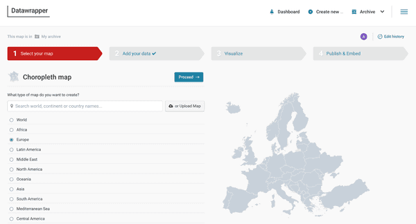 Choose Regions: After signing up or logging into Datawrapper, select the "Choropleth Map" option from the available map types. You’ll need to choose the geographic regions you want to map, such as countries, states, or districts.